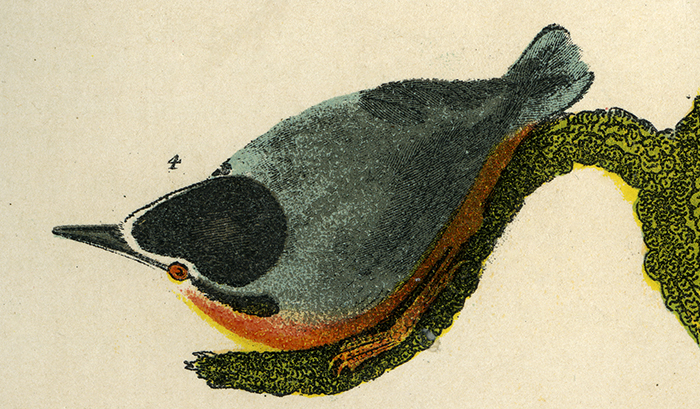 This bird is particularly fond of the seeds of pine trees. You may traverse many thousand acres of oak, hickory, and chestnut woods, during winter, without meeting with a single individual; but no sooner do you enter among the pines than, if the air be still, you have only to listen for a few moments, and their note will direct you where to find them. They usually feed in pairs, climbing about in all directions, generally accompanied by the former species, as well as by the titmouse, Parus atricapillus, and the crested titmouse, Parus bicolor, and not unfrequently by the small spotted woodpecker, Picus pubescens; the whole company proceeding regularly from. tree to tree through the woods like a corps of pioneers; while, in a calm day, the rattling of their bills, and the rapid motions of their bodies, thrown, like so many tumblers and rope dancers, into numberless positions, together with the peculiar chatter of each, are altogether very amusing; conveying the idea of hungry diligence, bustle, and activity.[15] Both these little birds, from the great quantity of destructive insects and larvæ they destroy, both under the bark and among the tender buds of our fruit and forest trees, are entitled to, and truly deserving of, our esteem and protection.